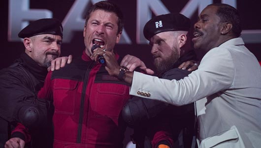 | Colman Domingo (phải) trong vai Bobby T, người dẫn chương trình The Running Man