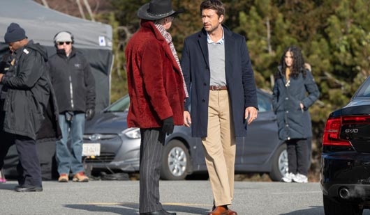 Đạo diễn Paul Feig, trái, trao đổi với Brandon Sklenar, chàng trai người New Jersey, trên trường quay The Housemaid tại Green Way Markets ở Ridgewood ngày 3 tháng 1 năm 2025