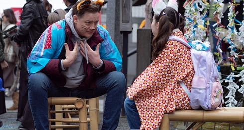 Diễn viên chính Brendan Fraser và đạo diễn Hikari (giữa) trên phim trường Rental Family