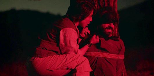 Một trong những kẻ bắt giữ buộc Rashid (Ebrahim Azizi, phải) phải chấp nhận phiên bản sự kiện của cô ta (Mariam Afshari)