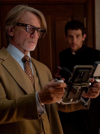 Daniel Craig (phải) trong vai Benoit Blanc, và Josh O’Connor trong vai linh mục bị tình nghi trong Wake Up Dead Man: A Knives Out Mystery (2025)