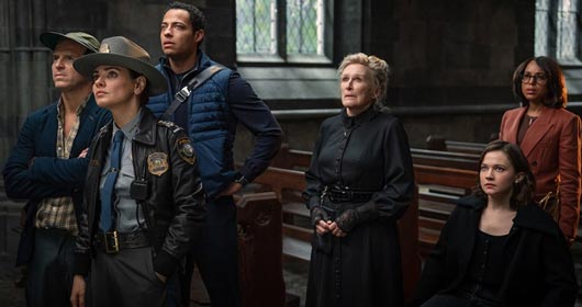 Từ trái qua: Andrew Scott, Mila Kunis, Daryl McCormack, Glenn Close, Kerry Washington và Cailee Spaeny trong Wake Up Dead Man: A Knives Out Mystery