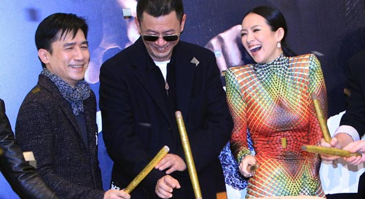 Lương Triều Vỹ (trái) cùng đạo diễn Vương Gia Vệ và nữ diễn viên Chương Tử Di tại buổi ra mắt phim Nhất đại tông sư ở Hồng Kông, tháng 1 năm 2013