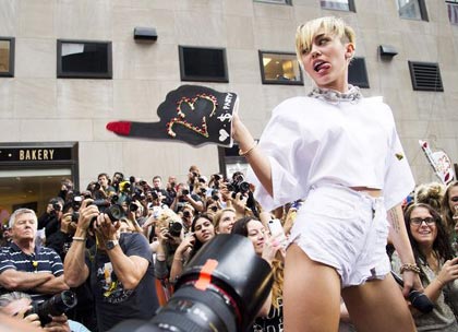 đặt câu hỏi, “Cuối cùng kẻ nổi loạn là ai? Miley lè lưỡi liếm láp khắp