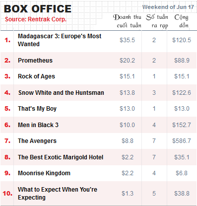 Phần tiền truyện khoa học giả tưởng rất được trông đợi Prometheus / Hành trình đến hành tinh chết vẫn ở vị trí nhì bảng, nhưng giảm tới 60% so với tuần công chiếu còn thu 20,2 triệu đôla, nâng tổng thu lên 88,8 triệu. Những bình luận trái chiều và thiếu sự bàn tán xôn xao hậu mở màn đã không giúp được Ridley Scott trong lần quay lại với thể loại mà ông từng giúp viết nên định nghĩa cách đây nhiều thập niên, vì thế hãy chờ đợi cuộc chạm trán với người ngoài hành tinh kết thúc lượt chiếu rạp với khoảng 130 triệu đôla.