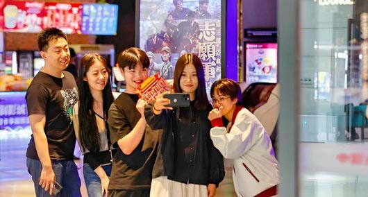 | Mọi người tự chụp ảnh với áp phích phim tại một rạp chiếu ở Thiên Tân, miền bắc Trung Quốc, ngày 4 tháng 10 năm 2025