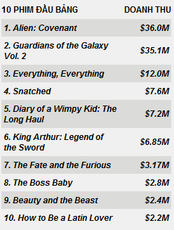 Hẳn là điều đó đã khiến cho doanh số cuối tuần vừa rồi trở thành một vụ nổ từ bên trong… ờ… bục ra. Với kinh phí sản xuất 97 triệu đôla (chưa tính chi phí marketing) Alien: Covenant đứng đầu bảng xếp hạng phòng vé Bắc Mỹ với 36 triệu, chỉ vừa đủ thắng được mấy gã Vệ binh dải ngân hà 2 đã bước sang tuần thứ ba. Phim cũng dẫn đầu phòng vé toàn cầu với 66,3 triệu ở kỳ cuối tuần rồi, và tổng cộng kiếm được 117,8 triệu từ khi ra rạp quốc tế cuối tuần trước.