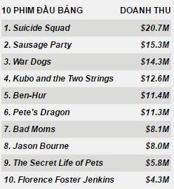 Suicide Squad lần thứ ba đứng đầu bảng tổng sắp (với 20,7 triệu đôla) và thành công bất ngờ của tuần rồi