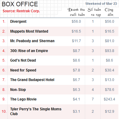 300: Rise of an Empire (Warner Bros.) thu được 8,7 triệu, sau ba tuần đạt 93,8 triệu.