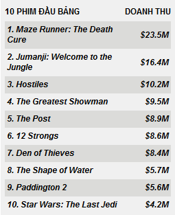 The Maze Runner: The Death Cure ra mắt với 23,5 triệu đôla. Thực tế, Fox có ba trên năm phim tốp đầu, bao gồm