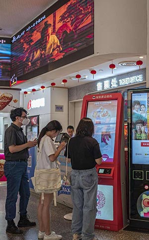 Người xem phim nhận vé từ máy bán vé tự động trong rạp chiếu phim ở Thượng Hải, ngày 26 tháng 7 năm 2023
