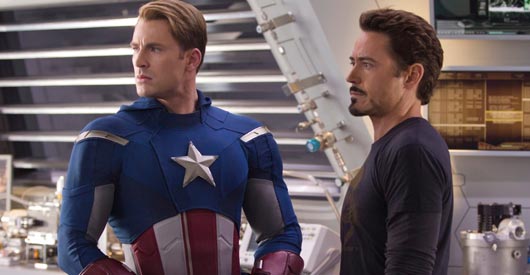 Chris Evans (Captain America) và Robert Downey Jr (Tony Stark) trong The Avengers; cả hai diễn viên đều trở lại trong Doomsday