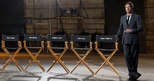 những chiếc ghế có ghi tên của từng diễn viên đóng trong Doomsday — kết thúc bằng cảnh Robert Downey Jr thong dong bước ra và nháy mắt với người xem