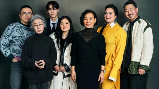 Từ trái qua: Bowen Yang, Youn Yuh Jung, Han Gi Chan, Kelly Marie Trần, Trần Xung, Lily Gladstone, và đạo diễn Andrew Ahn