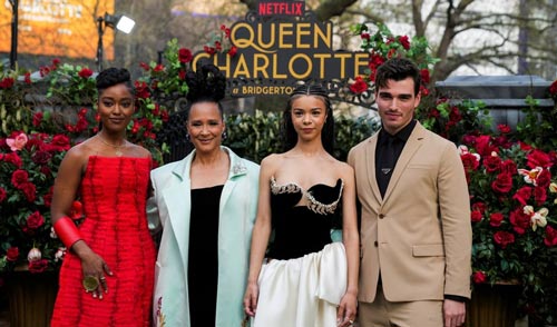 Ria Amarteifio và Corey Mylchreest tham dự buổi ra mắt thế giới Queen Charlotte: A Bridgerton Story của Netflix tại London vào ngày 21 tháng 4 năm 2023