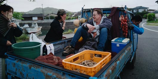 Diễn viên chính Brendan Fraser và đạo diễn Hikari (giữa) trên phim trường Rental Family