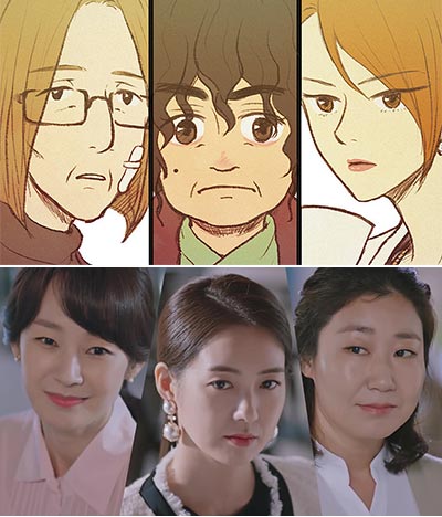 Trên: nguyên mẫu ba nhân vật trong webtoon Buam-dong Avengers’ Social Club Dưới: ba vai chính trong phim truyền hình Avengers’ Social Clubdựa theo webtoon trên