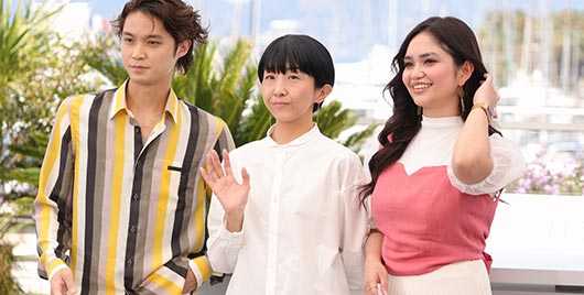 Hayakawa tại Cannes với hai diễn viên trong Plan 75, Hayato Isomura, trái, và Stefanie Arianne, đóng vai Maria