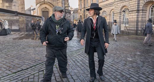 Guillermo del Toro (trái) và Oscar Isaac trên trường quay Frankenstein